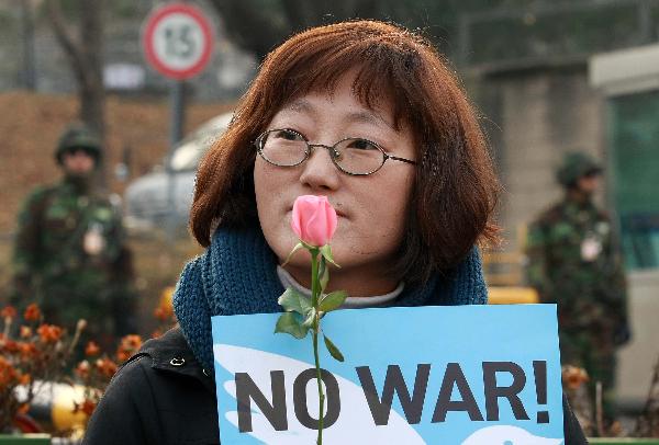 2010年11月30日 韩国女性祈和平反军演 11月30日,一名韩国女子在首尔参加示威,抗议韩国与美国在韩国西部海域(黄海)联合举行的军事演习。反对战争,祈求和平。新华社发(朴真熙摄)